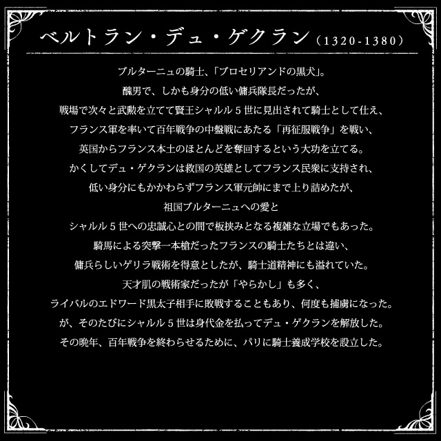 フランス北西部のブルターニュ公国で、公位継承問題が勃発。 継承権を主張するモンフォール家とパンティエーヴル家両家を、 それぞれイングランド王国とフランス王国が支援し、英仏両国による代理戦争が勃発する。 フランス王国の伝説的な軍人、ベルトラン・デュ・ゲクランも参戦。 |