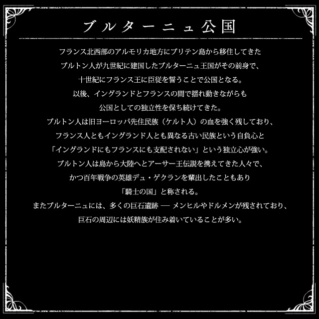 | 1378年 | 高まるブルターニュ独立への気運 フランス王国国王シャルル5世が、ブルターニュの王領への併合を宣言。これに反対した諸候たちによるブルターニュ独立運動が勃発する。ブルトン人たちの抵抗は激しく、フランス王国軍は苦戦を強いられた。これを受け、翌1379年にはイングランドに亡命していたブルターニュ公ジャン4世がブルターニュへ帰国。郷土の英雄として迎え入れられ、ブルターニュ勢の士気はますます高まる。 | 1380年 | デュ・ゲクランの死と第二次ゲランド条約締結