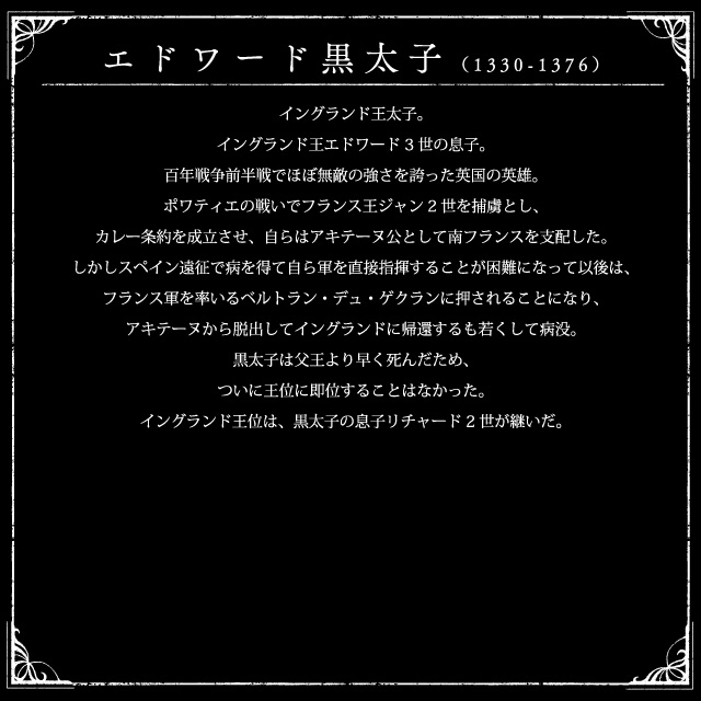 | 1376年 | 二人のエドワードの死去 エドワード黒太子がついに王位に就くことなく病没し、その翌年には父王のエドワード3世も死去する。このため、エドワード黒太子の遺児リチャード2世がわずか10歳で国王に即位した。 | |